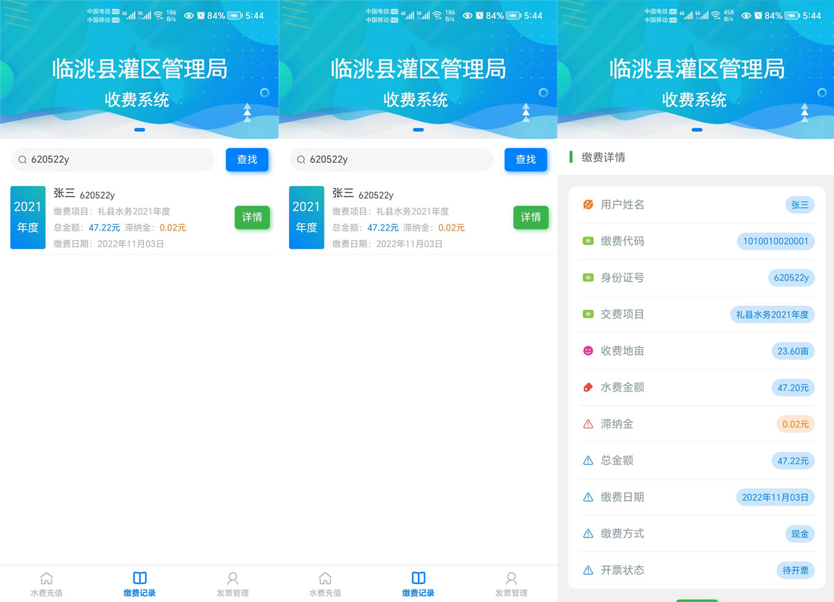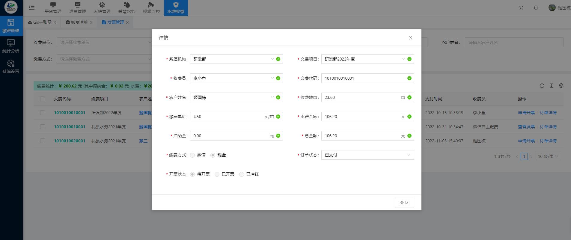 灌區(qū)收費(fèi)系統(tǒng)運(yùn)用計(jì)算機(jī)應(yīng)用技術(shù)以及相關(guān)的專用分析軟件和通訊網(wǎng)絡(luò)所組成的一個(gè)綜合性的收費(fèi)系統(tǒng)。通過對(duì)流經(jīng)用水戶的灌溉 時(shí)間以及流量的輸入,計(jì)算出該用水戶的水費(fèi),生成收費(fèi)賬單提交至上級(jí)審核 ,審核通過即可在線繳費(fèi)以及他人代繳功能。管理單位可以在手機(jī)和電腦網(wǎng)頁上同步查詢相應(yīng)的用水量以及繳費(fèi)情況。